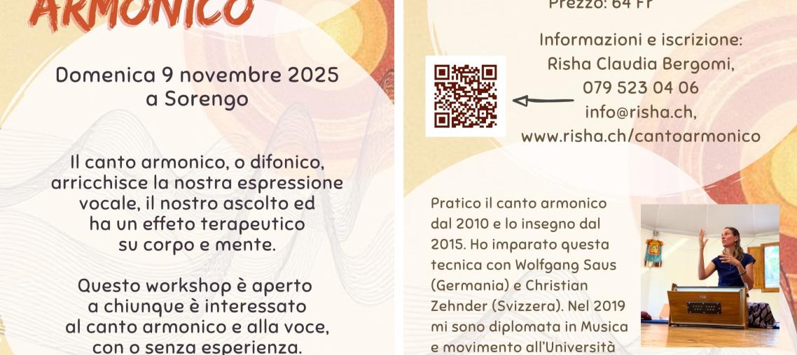 Informazioni e iscrizione: Risha Claudia Bergomi, 079 523 04 06, info@risha.ch o con il modulo di contatto su https://risha.ch/contact/