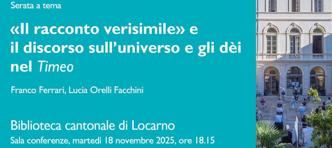 Il Timeo contiene un monologo in forma di racconto sulla genesi dell’universo e la nascita dell’uomo, che riprende i moduli narrativi delle cosmogonie e antropogonie arcaiche. Di recente è stato sostenuto che il brano metta in pratica i caratteri della buona retorica espressi nel Fedro. Rimane aperta la questione sul perché Platone abbia deciso di esporre questi temi ricorrendo a un mito. Franco Ferrari è professore ordinario di Filosofia Antica dell’Università di Pavia. I suoi interessi si incentrano su Platone e il platonismo antico. Per la collana BUR Classici ha tradotto e commentato Parmenide (Milano, BUR Rizzoli, 2004), Teeteto (id., 2011) e Menone (id., 2016). Tra le molte altre opere, anche Introduzione a Platone e La Repubblica di Platone (Bologna, Il Mulino, 2018 e 2022), il volume collettaneo Filosofia Antica (Milano, Le Monnier Università, 2024) e una rassegna critica sul Timeo in corso di stampa. Introduce la serata Lucia Orelli Facchini, vicepresidente dell’Associazione italiana di cultura classica, Delegazione della Svizzera italiana. Modera Stefano Vassere, direttore delle Biblioteche cantonali.
