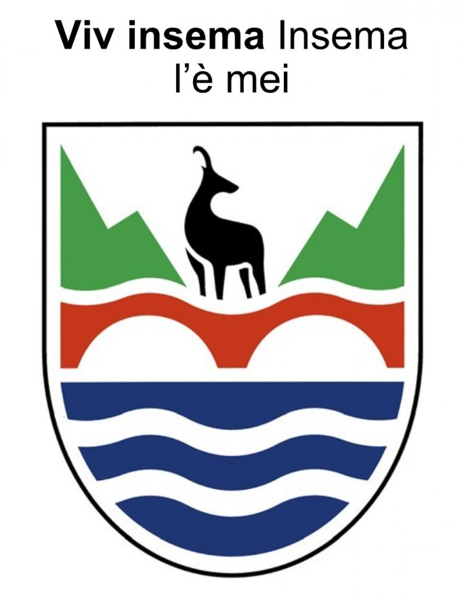 Il camoscio porta con sé diversi significati metaforici. In questo caso vuole simboleggiare una virtù selvaggia e autentica. Il ponte dei salti, elemento architettonico che più rappresenta il territorio, è un simbolo facilmente riconoscibile e unico, in grado di rendere fortemente identitario lo stemma. Le onde riprendono la sagoma del ponte rendendo così sinuoso e bilanciato l’insieme. È un elemento unico che unisce e accomuna i vari territori che attraversa, simboleggia la continuità. La valle, rappresentata dalle due montagne, forma una V che convoglia lo sguardo verso il centro dello stemma.