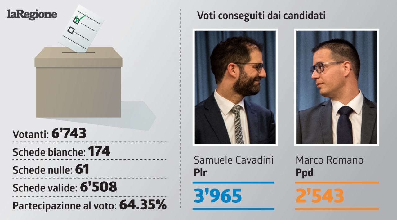 Samuele Cavadini, quindi, ce l'ha fatta. Il candidato Plr è riuscito nell'impresa di 'soffiare' la carica di sindaco al Ppd, superando,nei voti, il suo avversario Marco Romano. Alla conta delle schede, il risultato parla di un distacco importante: 3'965 voti (il 61%) per Cavadini, 2'543 per Romano. La partecipazione al voto si è attestata al 64,35%, con 6'743 aventi diritto che hanno espresso la propria preferenza; 174 le schede bianche, 61 quelle nulle.