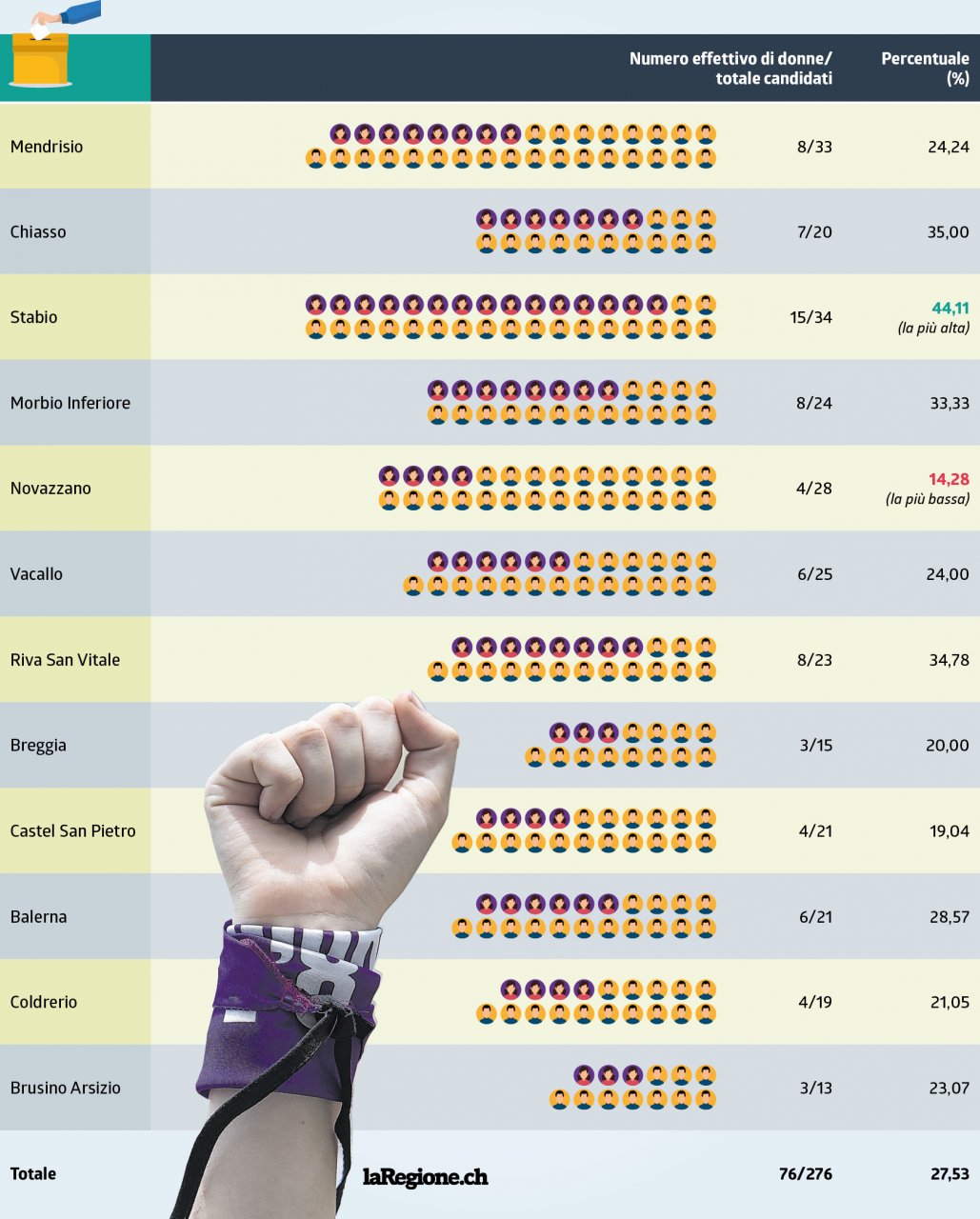 A cinquant'anni dalla conquista del voto alle donne in Svizzera la strada verso la parità di genere in politica sembra essere ancora lunga. Il Mendrisiotto non fa, purtroppo, eccezione nel panorama cantonale. Sole due, attualmente, le donne sindaca su dodici Comuni del distretto (il 16,6%); una percentuale che sale al 27,53%, se contiamo una a una le rappresentanti in corsa per gli esecutivi momò nelle elezioni comunali del 18 aprile (ovvero 76 candidate su un totale di 276). Poco di più, il 31,17%, per i Consigli comunali (come vedremo nella pagina che pubblicheremo nei prossimi giorni). Un viaggio fra seggi e 'santini', dunque, il nostro, che (in due puntate) va a raccogliere sei testimonianze di donne che hanno fatto della 'res publica' un impegno in prima persona. Cominciamo con il dire che fra il capoluogo e la cittadina di confine, a offrire le maggiori chance alle donne, è Chiasso: sono 7 sui 20 candidati al Municipio, ovvero il 35%, contro il 24,24% di Mendrisio (8 donne su 33 candidati). Una buona rappresentanza rosa la porta la Sinistra, mettendo in campo, nei due Comuni, 5 donne su 12 candidati; seguono Lega-Udc-Udf e Ppd-Gg-Verdi liberali con 3 candidate, chiude il Plr con 2. A Mendrisio la Lista civica sfodera, invece, quasi un 50% con 2 candidate su 5. Percentuali su e giù, come ci riporta l'infografia che presentiamo in questo approfondimento, che vanno, per i Municipi, dal primo posto, per spazio dato alle donne, di Stabio (15 su 34 con una percentuale del 44,11%) al fanalino di coda Novazzano (4 su 28 e cioè il 14,28%). Il resto dei Comuni si attesta fra il 19 e il 34%. Non c'è, insomma, da essere soddisfatte.