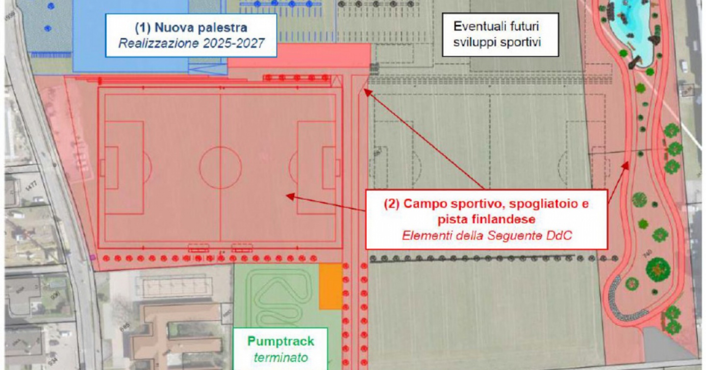 Il progetto prevede una pista finlandese, un biotopo e il nuovo spogliatoio, il cui tetto sarà interamente ricoperto da pannelli fotovoltaici