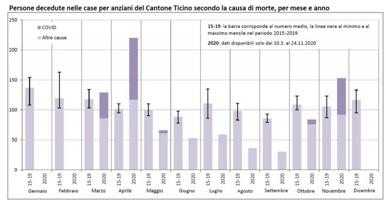 L'aumento dei casi rilevati nelle case anziani durante la seconda fase, prosegue Merlani, «è spiegabile sicuramente con il numero maggiore di test e di controlli». In retrospettiva «ad aprile, la mortalità media in casa anziani tra il 2015 e il 2019 si aggirava attorno al 100 mentre nel 2020 è praticamente raddoppiata a causa dei casi covid-19. A maggio invece i decessi sono inferiori alla media così come nei mesi di luglio, agosto e settembre. Vi è dunque stata una minore mortalità dovuta alla sovramortalità dei mesi della prima ondata». A novembre «la mortalità generale, spinta dai decessi per coronavirus, è tornata ad essere superiore alla media».