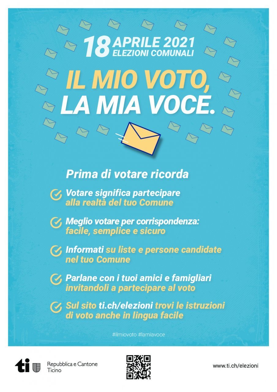 «Il mio voto, la mia voce», questo il titolo della campagna con la quale il Governo cantonale intende ricordare l’importanza della partecipazione al prossimo voto del 18 aprile 2021 per il rinnovo dei Municipi e dei Consigli comunali, per il quale settimana prossima inizierà la distribuzione del materiale di voto nei Comuni interessati. Le cittadine e i cittadini potranno informarsi sulle modalità di voto grazie al materiale ricevuto per posta, o consultando il sito web www.ti.ch/elezioni, che quest’anno conterrà anche istruzioni in «lingua facile».