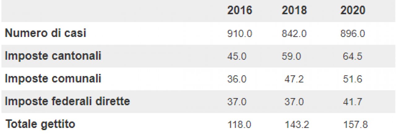Complessivamente, il gettito delle imposte sul reddito e la sostanza dei globalisti in Ticino, sommando l'imposta cantonale, l’imposta comunale e l’imposta federale diretta, ammonta a 157,8 milioni di franchi nel 2020, quasi 15 milioni in più rispetto ai 143,2 del 2018 e una cifra maggiore di quasi 40 milioni rispetto al 2016 nonostante il numero minore di contribuenti.
