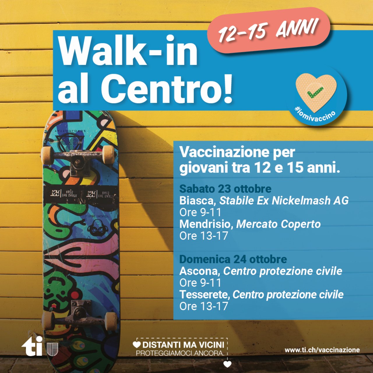 Un altro fine settimana dedicato alle vaccinazioni vicino casa dei giovani fra i 12 e i 15 anni: il 23 e 24 ottobre 2021, infatti, verranno aperti i centri di vaccinazione di Mendrisio e Biasca (sabato 23 ottobre), e di Tesserete e Ascona (domenica 24 ottobre) nei quali sarà possibile per gli adolescenti vaccinarsi senza appuntamento (in modalità detta “walk-in”) e ricevere la prima dose di vaccino. Per la seconda dovranno successivamente recarsi al Centro cantonale di Giubiasco.