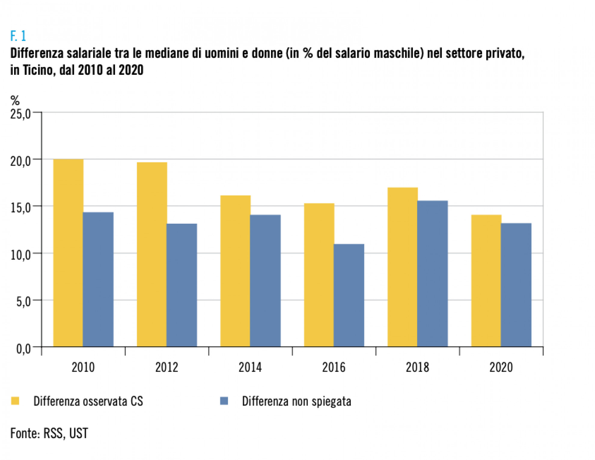 Le differenze salariali medie tra donne e uomini nel settore privato, in Ticino, si sono ridotte nell’ultimo decennio passando dal 20% del 2010 al 14% del 2020: un dato comunque elevato a livello europeo, ma ormai pressoché identico a quello nazionale. Tuttavia la quasi totalità di questo divario – il 13,2% – risulta non spiegato: è cioè sostanzialmente presente anche a parità di mansione, livello di istruzione, settore di impiego e tutte le altre variabili che non siano il genere in sé e per sé. Così, anche in un mondo in cui le donne risultano meno confinate in posizioni subalterne, alla fine del mese è come se dovessero pagare una tassa di discriminazione. È quanto emerge leggendo uno studio appena pubblicato dall’Ufficio di statistica ticinese (Ustat).