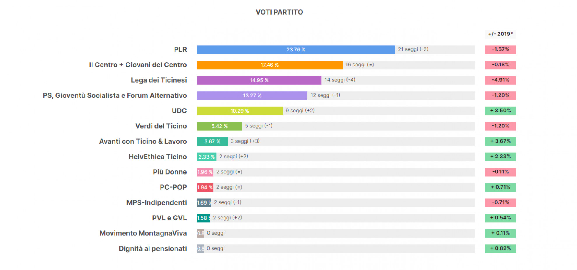 Il Gran Consiglio che esce dalle elezioni cantonali 2023, di cui dopo oltre 12 ore si è appena concluso lo spoglio si presenta ulteriormente frammentato. Le urne hanno certificato da una parte la sconfitta della Lega dei Ticinesi che perde 4 seggi rispetto al 2019, dall'altra l'affermarsi di partiti minori e movimenti, primo fra tutti Avanti con Ticino&Lavoro che, al debutto, porta a casa 3 seggi così come HelvEthica che avrà due granconsiglieri nella prossima legislatura. Dopo il calo delle scorse legislature, il Centro riesce a conservare i suoi 16 seggi, mentre il Plr, il partito più votato con il 23,76% perde due granconsiglieri.