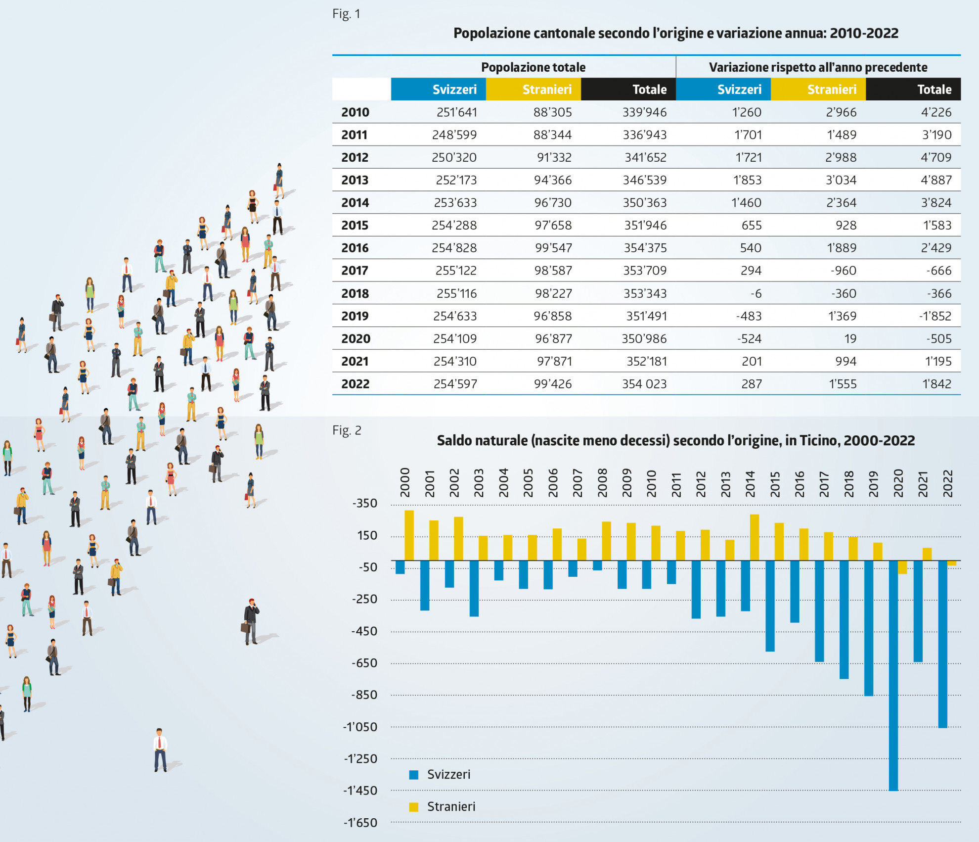 Nel 2022 ha superato le 354mila unità (figura 1), con un incremento di 1’842 residenti, pari allo 0,5%. Un incremento inferiore a quello svizzero che è stato dello 0,9%. Va però tenuto conto che in Ticino, cantone di frontiera, l’esigenza di importare manodopera, determinante nella crescita della popolazione, è meno marcata che nella maggior parte dei cantoni. Se questa ripresa demografica rappresenti o meno un reale miglioramento del benessere materiale dei residenti sarà compito degli specialisti valutarlo, districandosi tra i numerosi indicatori globali quali il Pil, i tassi di inflazione e disoccupazione, il reddito pro capite, eccetera. Lasciamoci sorprendere.