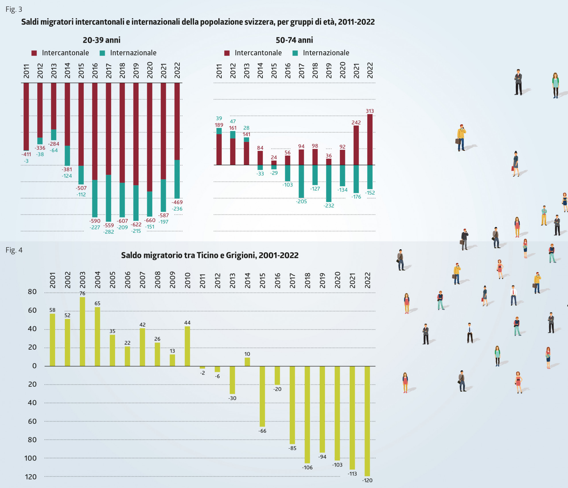 Da un lato, assistiamo a un importante esodo dei giovani verso cantoni universitari prediletti dai ticinesi, come Zurigo, Vaud, Friburgo, Berna, e che offrono nel contempo interessanti opportunità di lavoro. Dall’altro, il nostro cantone è sempre più attrattivo per numerosi confederati che apprezzano la qualità di vita del Sud delle Alpi e si trasferiscono in Ticino, in particolare raggiunta l’età di pensionamento. Vi è poi il caso dei Grigioni che, da una decina di anni, sta attirando un numero sempre più importante di ticinesi (fig. 4). Il saldo complessivo dei movimenti migratori intercantonali è stato per anni negativo per il nostro cantone, arrivando fino alle -600 unità nel quinquennio 2015-20. Recentemente però si è registrato un calo sensibile con un -321 nel 2021 e -44 nel 2022. Si potrebbe pensare a un ritorno di attrattività del nostro cantone, ma non è purtroppo il caso. I giovani continuano a lasciare il Ticino. Nel 2022 le partenze dei residenti di 20-39 anni hanno superato gli arrivi di ben 705 unità: 469 a favore degli altri cantoni svizzeri, 236 a favore di altre nazioni (fig. 3).