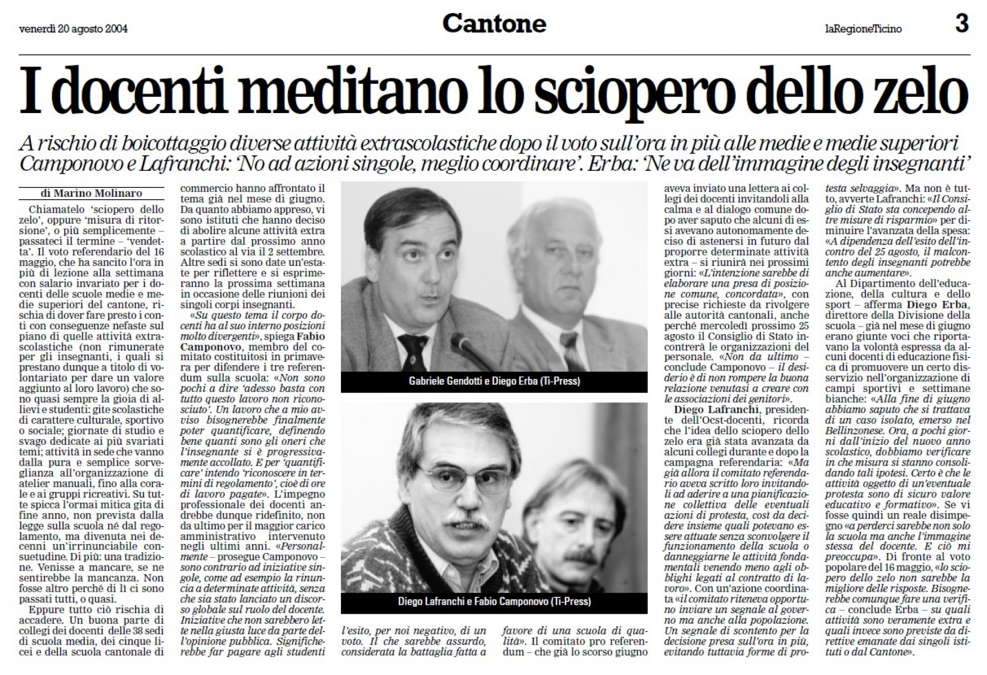 «Da tempo – sottolinea il presidente del Movimento della Scuola Fabio Camponovo – denunciamo il lento degradarsi della funzione dell’insegnante e ciò anche a causa dei tagli, negli anni, decisi dalla politica, soprattutto da quella parte della classe politica che considera i docenti, e in generale i funzionari, come dei privilegiati, veicolando questa immagine nella popolazione. Un’immagine falsa. Come è stato ricordato ancora in questi giorni, il Ticino è uno dei Cantoni che investe meno nell’istruzione, eppure è tra quelli che presenta i migliori risultati come numero di maturati e di diplomati universitari. Questo grazie soprattutto all’impegno, ai sacrifici e alla responsabilità del corpo docente». Le «ulteriori» misure di risparmio nei confronti dei dipendenti pubblici contenute nella manovra di rientro confezionata di recente dal Consiglio di Stato, continua Camponovo, che precisa di esprimersi a titolo personale, «non si giustificano. Penso che i docenti debbano affrontare oggi due problemi fondamentali: avere il coraggio di difendere la dignità della professione e concordare delle misure di resistenza a vantaggio della qualità del loro lavoro. Sarebbe improvvido manifestare il disagio in forme diverse, quando invece un segnale pubblico forte potrebbe giungere da uno sciopero vero e proprio».
