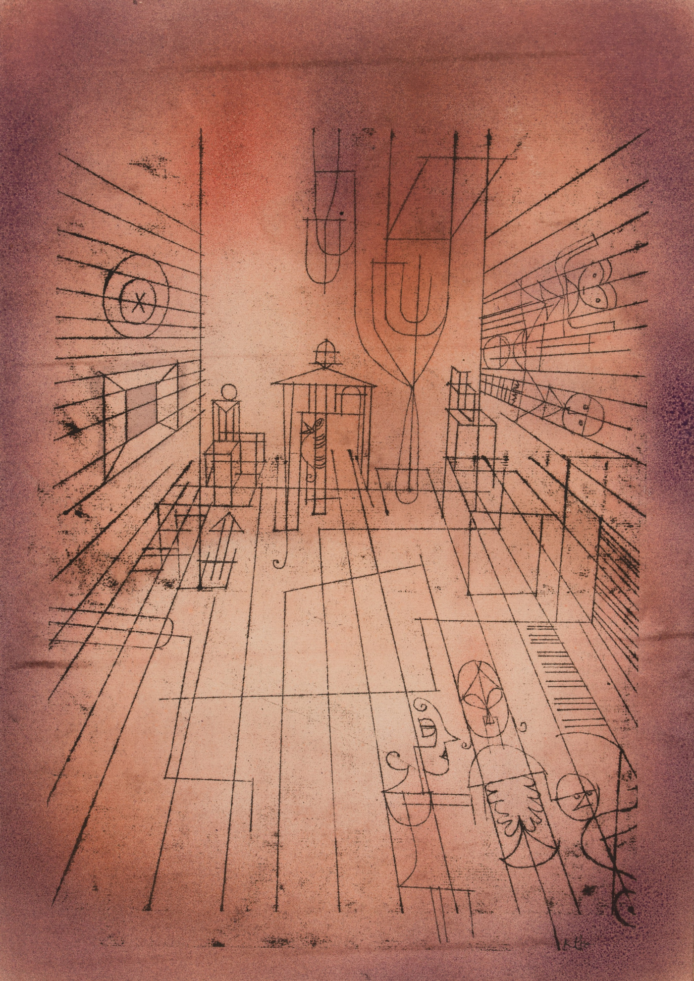 Genere non subordinato agli "aristocratici" dell’espressione artistica, il disegno non è considerato da Klee (dal tratto abile) come schizzo o bozzetto preparatorio, bensì è opera a sé stante. Nella testa aveva la linea dell’arte preistorica e dei disegni dei bambini – spontanea, autentica, essenziale –: partendo da lì, l’artista "porta a spasso" le sue linee, che sono dritte, spezzate, verticali, orizzontali, tonde, numeri, segni, lettere, simboli. L’elemento non è "solo" un atto, bensì è fondamento chiave di qualunque pensiero espressivo (e anche teorico), sia esso ironico, umoristico, drammatico e divertito, ma anche narrativo.