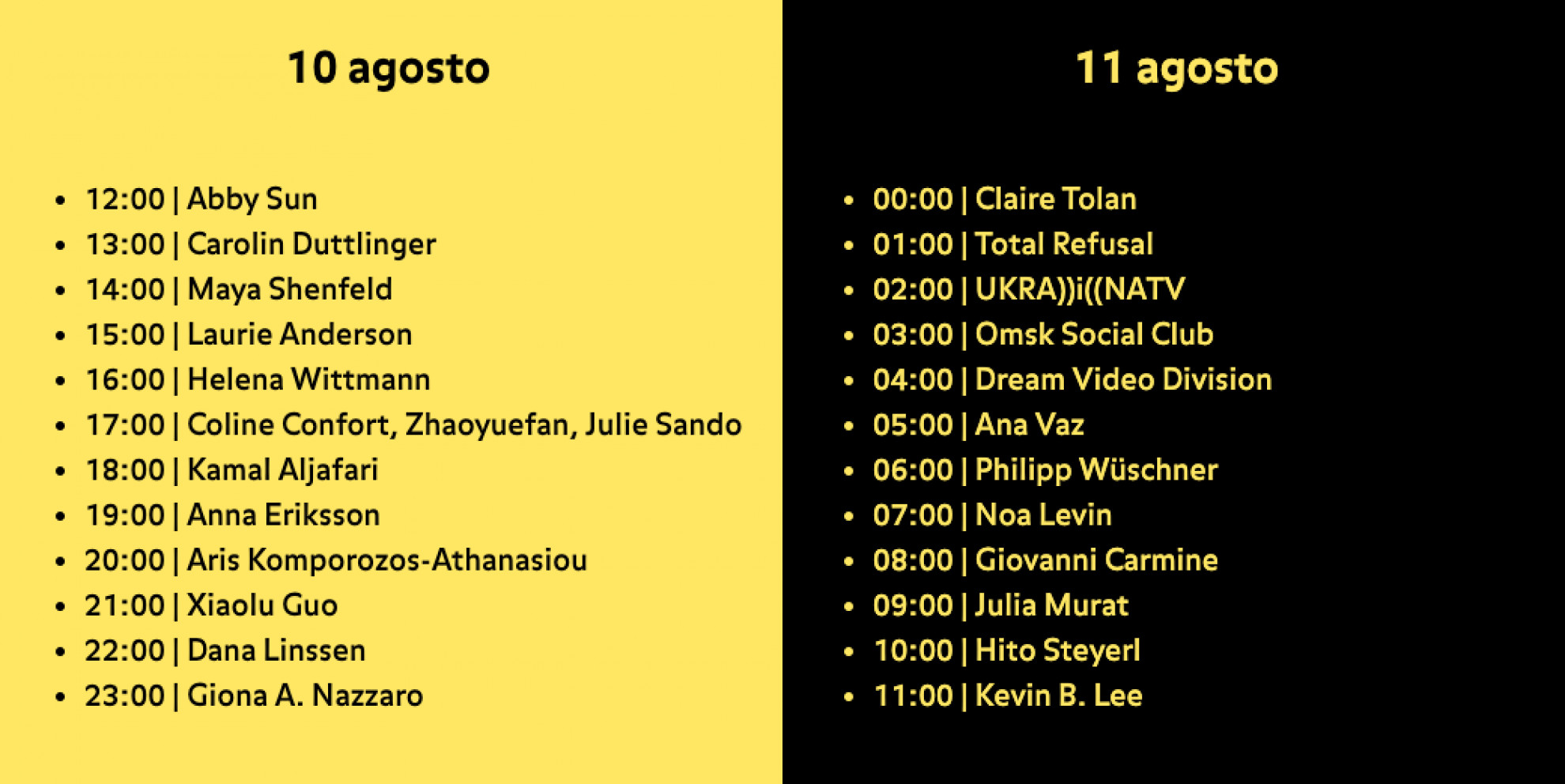 Tra i relatori inviatati abbiamo Kevin B. Lee, titolare della cattedra sul futuro del cinema all’Usi, la vincitrice del Vision Award Laurie Anderson, la cineasta Hito Steyerl e poi ancora esperti sull’attenzione come Carolin Duttlinger, docente all’Università di Oxford e autrice di ‘Attention and Distraction in Modern German Literature’, e Aris Komporozos-Athanasiou, professore all’University College di Londra. Ci saranno anche una serie di interventi sperimentali di collettivi in streaming, tra cui il collettivo ucraino con sede a Cracovia. A moderare l’incontro ci saranno Devika Girish, Khesrau Behroz e Milosz Paul Rosinski.