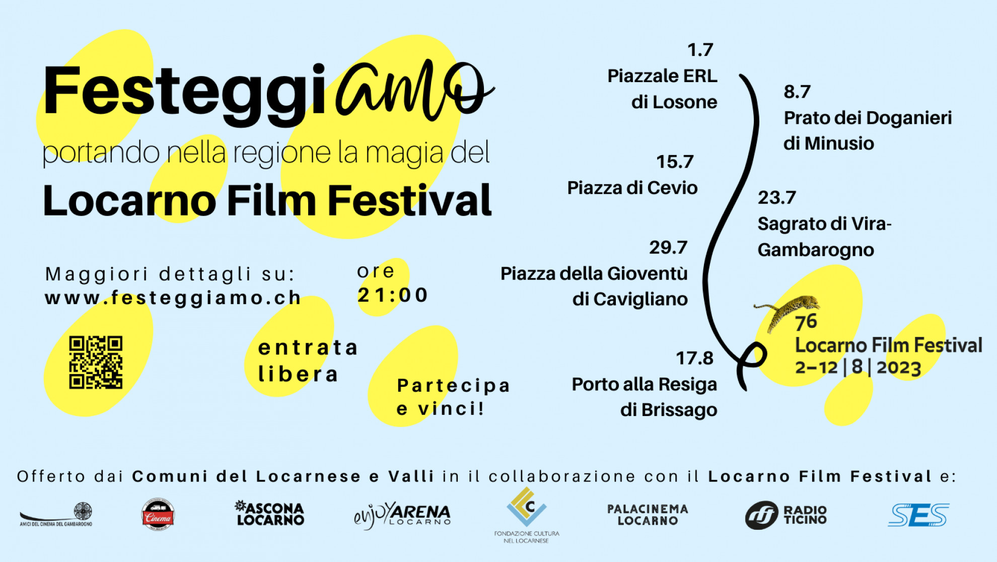 I film in lingua straniera verranno proiettati con i sottotitoli in italiano; inoltre, durante ogni serata ci sarà l'estrazione a sorte di un abbonamento per la 76esima edizione del Festival. Le informazioni complete (così come le date alternative in caso di pioggia) sono reperibili su www.festeggiamo.ch e sui portali social dedicati (Facebook e Instagram).