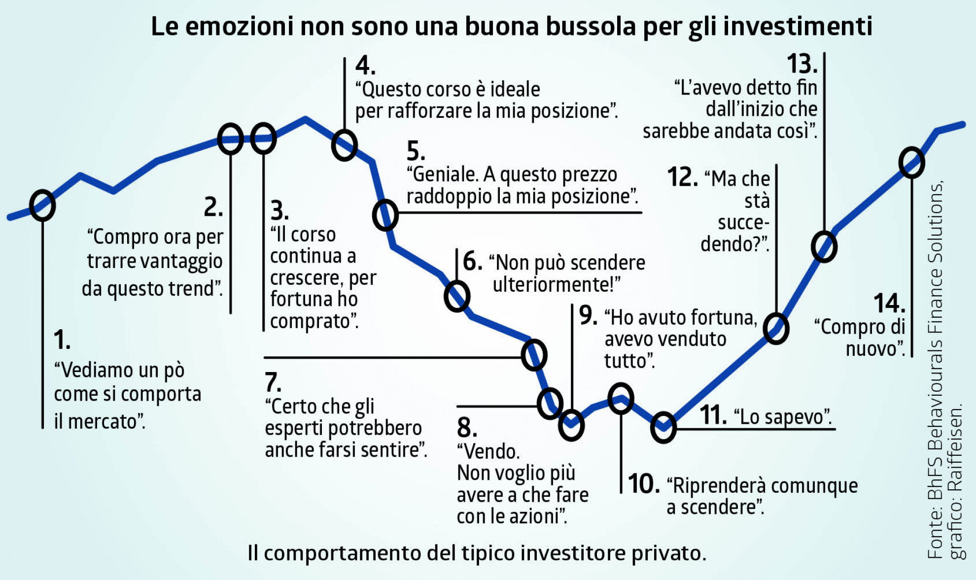 Quando sui mercati tutto va bene, fare investimenti è divertente. Quando invece i corsi tendono al ribasso, la situazione può diventare opprimente e si prendono decisioni d’investimento sconsiderate o avventate. Questo tipico comportamento degli investitori quando i mercati azionari salgono e scendono è illustrato dal grafico.