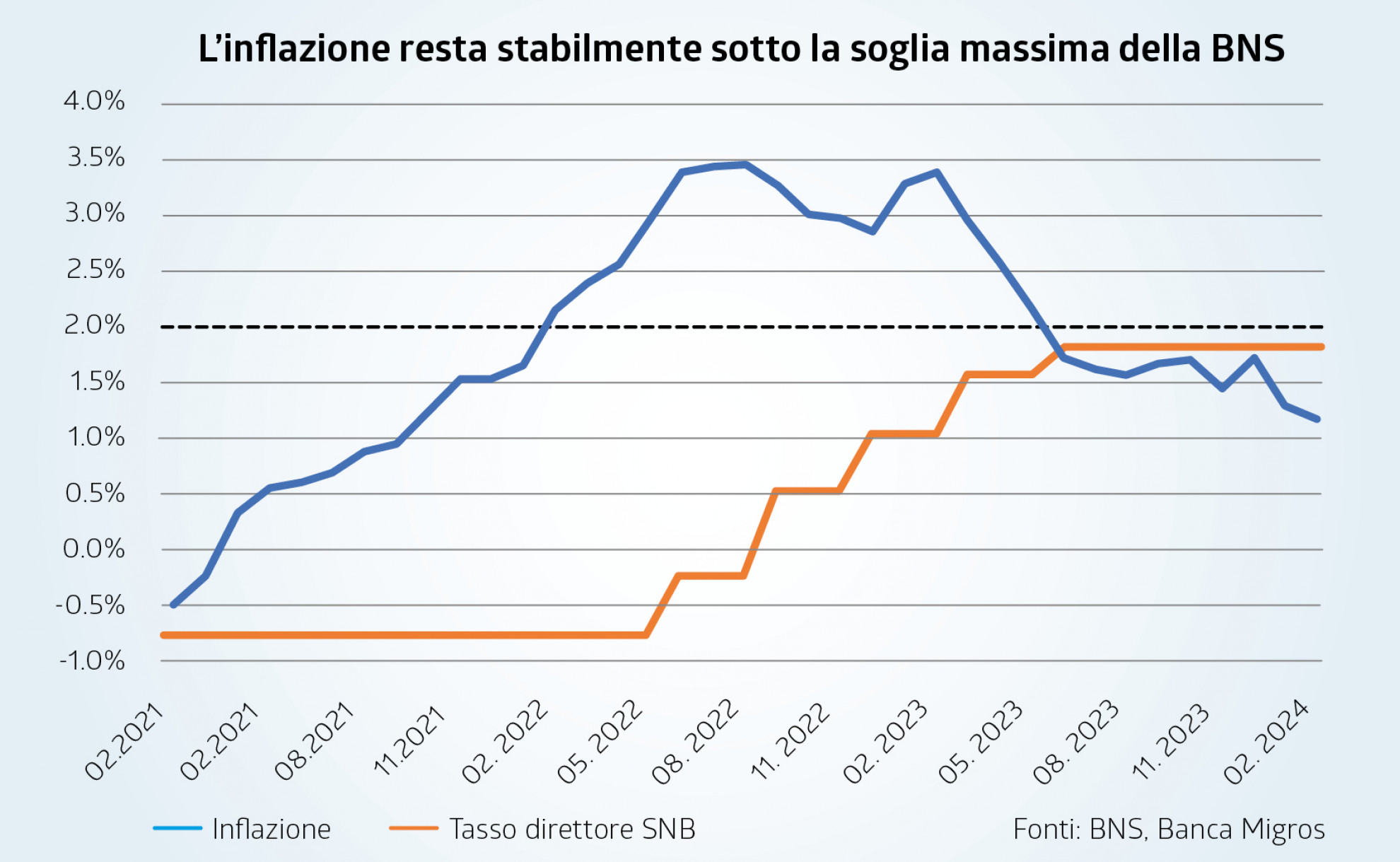 In risposta alla fase inflazionaria scatenatasi sia dagli squilibri dell’offerta non ancora ripresasi completamente dalle restrizioni legate alla pandemia di fronte a una forte domanda e dallo scoppio della guerra in Ucraina, la BNS nel giugno 2022 ha ritoccato per la prima volta dal 2015 il tasso direttore, aumentandolo poi gradualmente in ogni seduta fino al giugno 2023. L’aumento di 250 punti base dal -0,75% fino al 1,75% è stato efficace nel combattere l’inflazione, la quale è rientrata nella fascia definita dalla BNS come quella della stabilità dei prezzi (tra lo 0% e il 2%) sempre nel giugno 2023. Il calo è poi proseguito nel corso della seconda metà del 2023 e a febbraio 2024 si attestava al 1,2%.