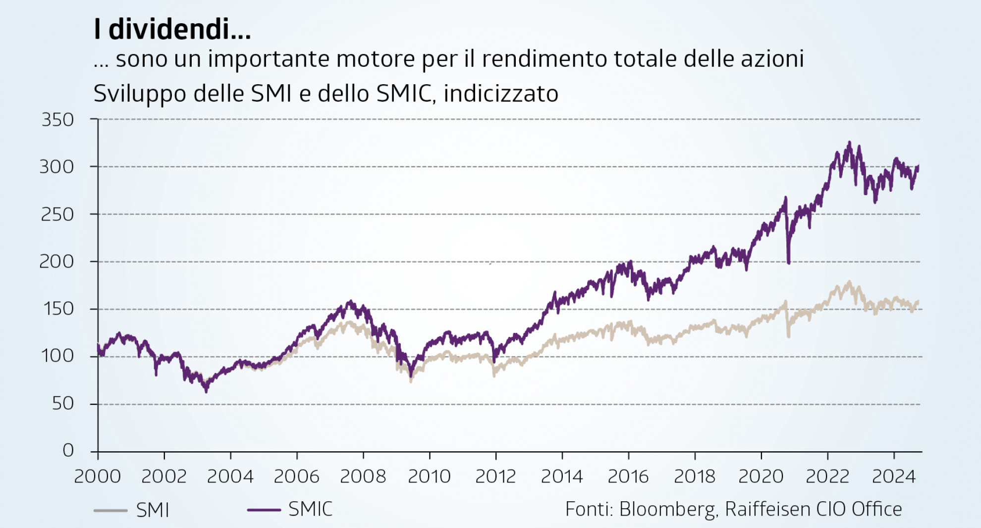 Il mercato azionario svizzero fa fatica a raggiungere un nuovo massimo storico, ma vi è comunque un record che merita di essere segnalato: nel 2024 le imprese quotate sulla borsa svizzera pagheranno un totale di circa 64 miliardi di franchi in dividendi ai loro azionisti. È utile ricordare come i dividendi siano una componente importante del rendimento totale a lungo termine degli investimenti azionari. Dall’inizio del millennio, lo Swiss Market Index (SMI) ha mostrato una crescita di circa il 50%, crescita che tenendo conto anche delle retribuzioni sale al 189%. Attualmente, il rendimento medio dei dividendi sullo SPI (Swiss Performance Index) è quasi pari al 3%, ovvero circa il doppio dell’attuale tasso d’interesse annuo offerto dai conti risparmio o dal rendimento medio delle obbligazioni in franchi svizzeri incluse nello Swiss Bond Index (SBI AAA-BBB). Evidentemente bisogna tenere conto della diversa volatilità delle classi d’investimento, dove le oscillazioni dei corsi delle azioni possono essere considerevoli. È importante segnalare come il pagamento di dividendi spesso segnala al mondo finanziario un modello aziendale solido e con profitti stabili. Con questo modello le aziende aumentano la fiducia degli investitori e li incoraggiano a detenere un’azione a lungo termine. Per questo, molte aziende svizzere non solo distribuiscono regolarmente una parte degli utili, ma li aumentano costantemente. Lo Swiss Market Index (SMI) da anni offre quindi un interessante rendimento da dividendi nel confronto internazionale. Ad esempio negli Stati Uniti le aziende preferiscono, per tradizione, riacquistare i propri titoli, rispetto a una distribuzione degli utili tramite il dividendo.