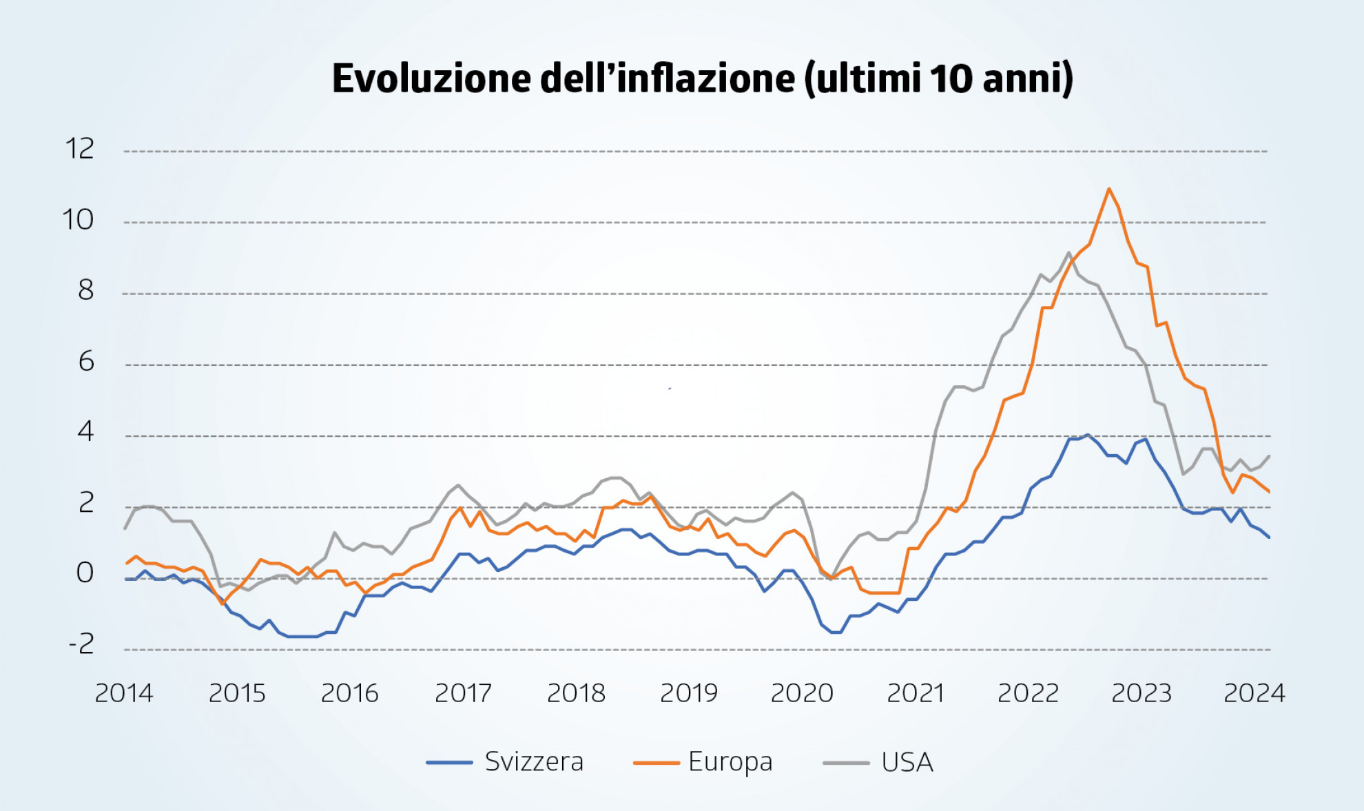 Per diverso tempo la si era data per domata ma l’inflazione è tornata d’attualità, specie dopo il terzo mese consecutivo di ripresa negli Stati Uniti. In Europa la situazione sembra sotto controllo, ma è bene restare vigili per scongiurare possibili riprese, potenzialmente alimentate ancora una volta dai prezzi dell’energia. In Svizzera il tasso di rincaro è ben più limitato, grazie al buon lavoro di contenimento svolto dalla BNS negli scorsi anni su più fronti, nella consapevolezza dell’importanza strutturale di un’inflazione sotto controllo per il sistema paese. Il futuro potrebbe però riservare delle sorprese. Le banche centrali all’unisono ribadiscono l’obiettivo rigido del 2%, valore che nei prossimi anni potrebbe però risultare difficile da ottenere stabilmente. I cambiamenti in atto a livello mondiale, con governi impegnati nell’aumento delle spese militari, in un contesto geopolitico decisamente meno stabile, la trasformazione energetica e un probabile rallentamento del processo di globalizzazione – in realtà già innescato dalla pandemia – depongono a favore di una possibilità non remota di valori di inflazione più alti da qui a fine decennio. Le statistiche ci dicono che negli Stati Uniti è improbabile un rientro al 2% nei prossimi dodici mesi, complice l’effetto base che interverrà da fine estate e probabilmente neppure l’Europa riuscirà stabilmente nell’intento nel prossimo anno. Sarà interessante osservare come la Banca Centrale Europea e la Federal Reserve americana reagiranno a un contesto del genere: nuovi adeguamenti in ambito di politica monetaria o piuttosto una revisione dell’obiettivo di lungo termine? È improbabile che noi potremo sottrarci a queste dinamiche, ma la BNS ha un buon margine di manovra. La Svizzera resterà un’isola felice in questo ambito con la possibilità che se l’inflazione importata dovesse tornare a salire marginalmente vedremo un rafforzamento del franco piuttosto che una manovra sui tassi di interesse.