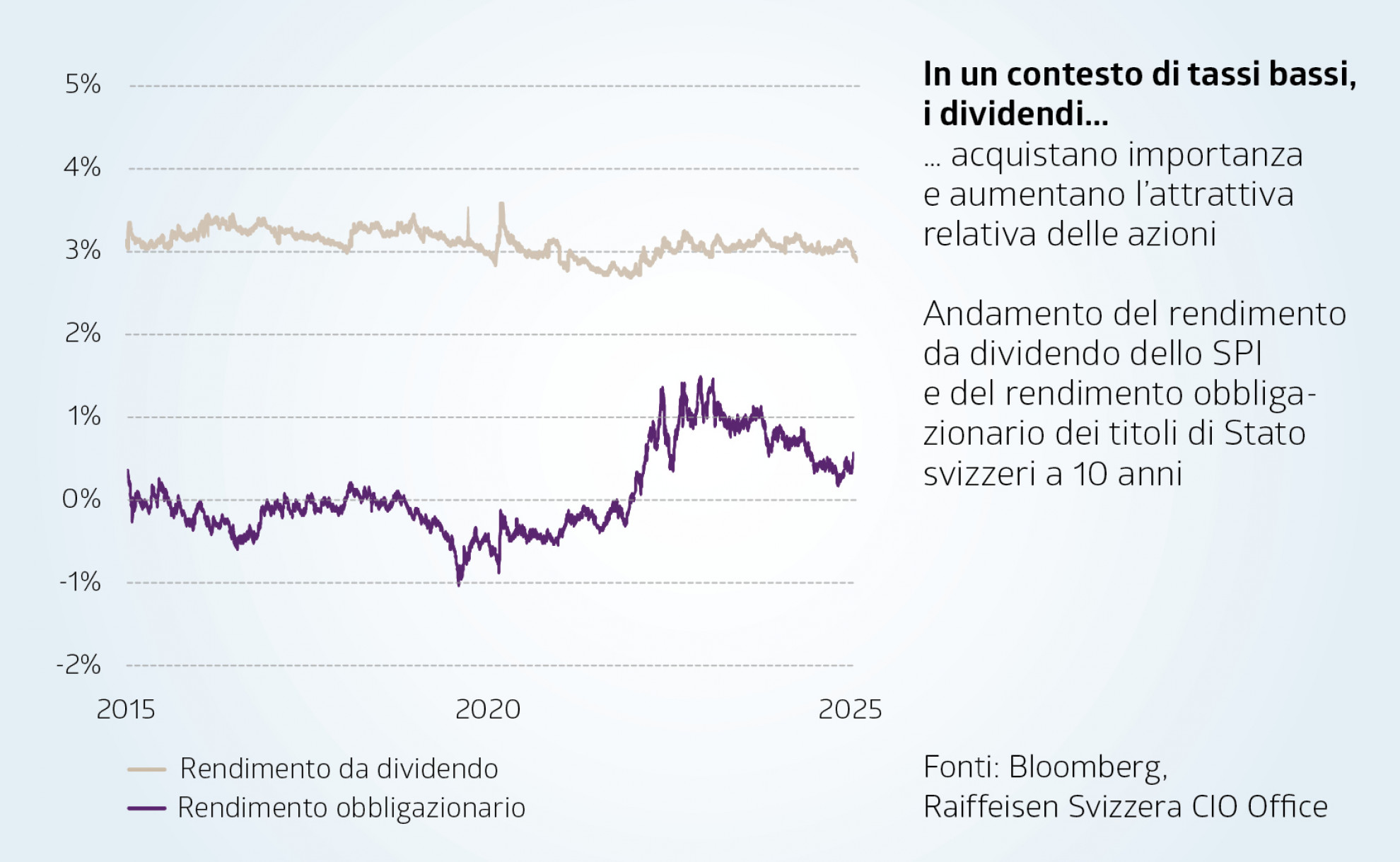 Il rendimento da dividendo dello SMI è attualmente del 2.9%. In confronto quello dei titoli di Stato svizzeri a 10 anni è sceso allo 0.4%, provento che attualmente non compensa più nemmeno l'inflazione. Naturalmente, le azioni sono molto più volatili delle obbligazioni. Tuttavia, per chi ha un orizzonte d’investimento lungo e una certa propensione al rischio, le azioni delle società finanziariamente solide e ad alto dividendo restano la prima scelta.