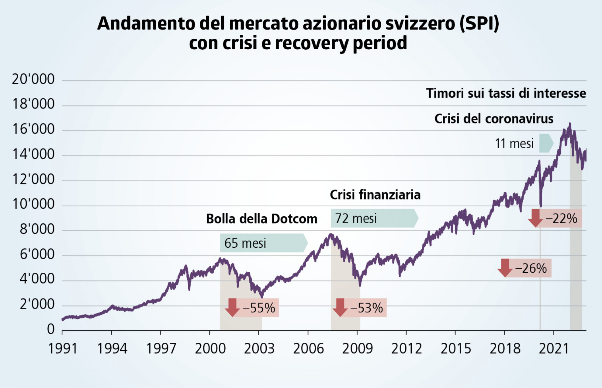 Nonostante le molte crisi avvenute nel corso degli anni, il mercato tende sempre a riprendersi. Un’analisi a lungo termine del mercato azionario svizzero (SPI) mostra che, malgrado ripetute battute d’arresto, quali lo scoppio della bolla delle dot-com nei primi anni 2000, la crisi finanziaria del 2008, la pandemia di Covid-19 nel 2020, la recente crisi dei tassi in rialzo e infine, l’incertezza generata dalle politiche tariffarie di Trump, negli scorsi 30 anni gli investitori hanno realizzato utili di capitale. Questo dimostra che, nonostante le turbolenze, la tendenza a lungo termine del mercato è verso l’alto. Le oscillazioni di breve periodo vengono compensate negli anni, rendendo la strategia di investimento a lungo termine una delle più efficaci per ottenere rendimenti significativi.