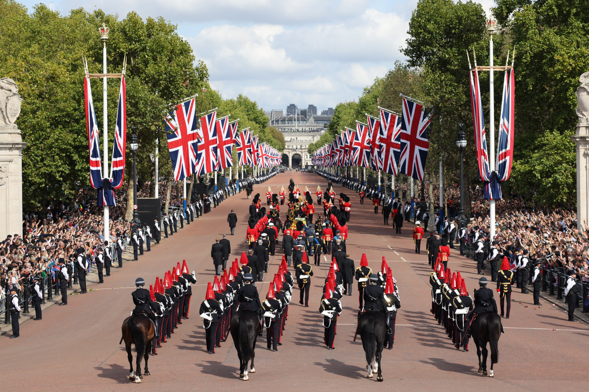 La bara di Sua Maestà, avvolta nello stendardo reale e sovrastata dalla Corona Imperiale, oltre che da un cuscino di fiori colti tra i suoi preferiti nel giardino del castello di Windsor e in quello della residenza scozzese di Balmoral in cui è spirata, ha compiuto il tragitto fino a Westminster su un affusto di cannone trainato da cavalli, come tradizione impone. Sotto gli squarci di un sole settembrino spuntato all’improvviso (dopo la serata piovosa che ieri sera aveva accolto il ritorno dei resti dalla monarca dalla Scozia) nel cielo londinese, ripulito dai rumori per un paio d’ore anche grazie al rinvio o alla deviazione di diversi voli di linea.