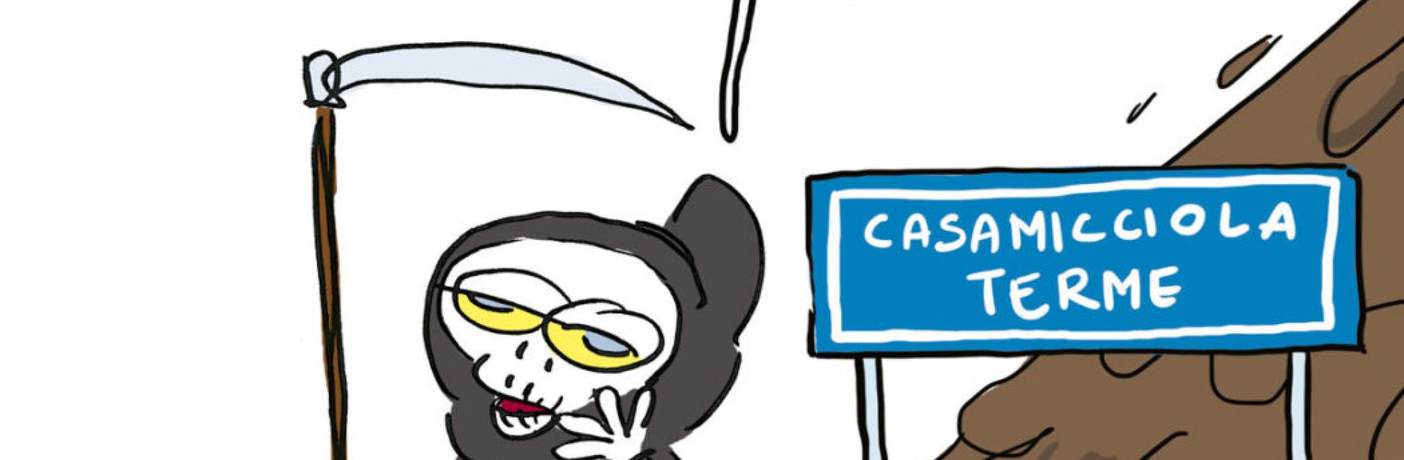 Nel disegno si vede la morte con la falce in mano davanti a uno scorcio di montagna fangosa con un cartello stradale che indica la località di Casamicciola Terme; un fumetto chiede "Come mai di nuovo ad Ischia?" e la morte risponde "Per i fanghi, come sempre".