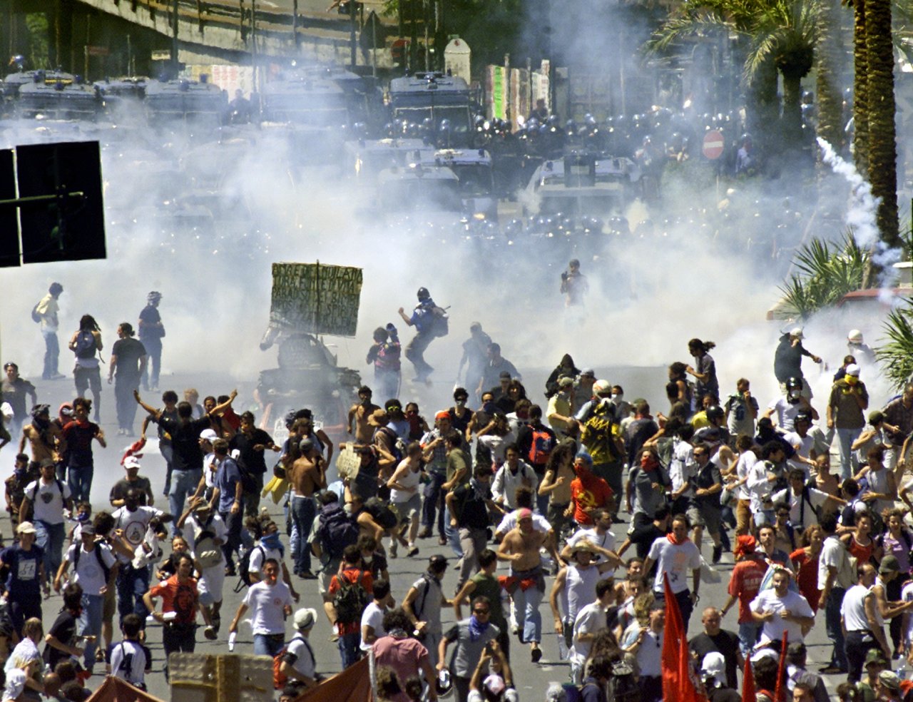 Un manifestante davanti alla polizia il 20 luglio 2001 (Keystone)