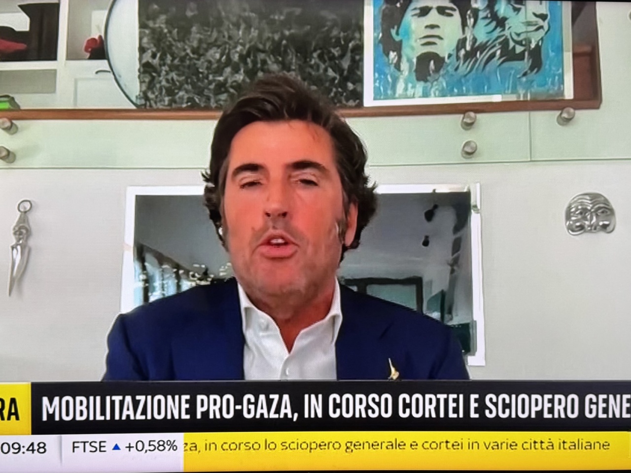 In nome del “non sono d’accordo con quello che dici, però darei la vita perché tu lo possa dire” (ma in questo caso uccidersi sarebbe un atto di ingiustificata generosità), lo ascoltiamo nella narrazione della settimana, ovvero ricondurre l’onda pacifista a una manovra sovversiva e dare dei ciarlatani a quelli sulle barche. Tutto già sentito, non fosse che la scenografia affossa la retorica leghista, perché alle spalle del senatore non c’è la libreria, che è troppo di sinistra, ma – appesi a una parete e simmetricamente disposti: 1. Il cornicello scacciajella, non rosso ma d’argento. 2. La maschera di Pulcinella, “personaggio ironico e sfrontato che non ha paura di prendere in giro i potenti e di svelare i retroscena della società” (dall’Enciclopedia digitale), anch’essa d’argento. 3. Il quadro di Diego Armando Maradona, patrono di Napoli. In questa esplosione di napoletanità alla quale mancherebbero solo la pizza e il mandolino (d’argento), colpisce, appuntata sulla giacca del politico, la spilla di Alberto da Giussano, simbolo leghista che con la napoletanità c’entra come l’ananas sulla pizza (napoletana).