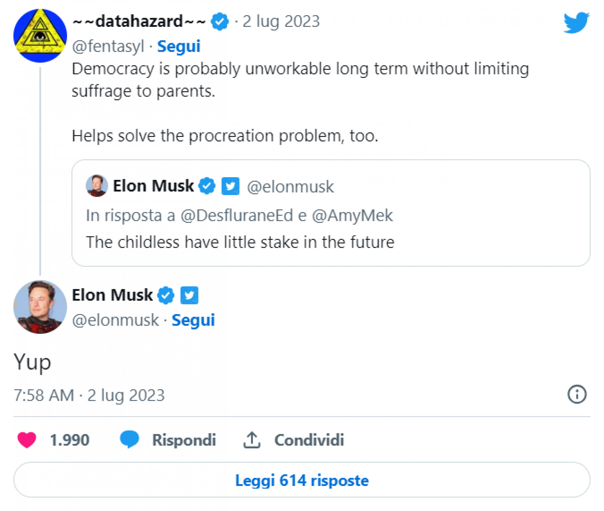 Il patron di Twitter e Tesla sostiene l'idea di limitare il suffragio ai soli genitori (e strizza l'occhio ai conservatori e suprematisti)