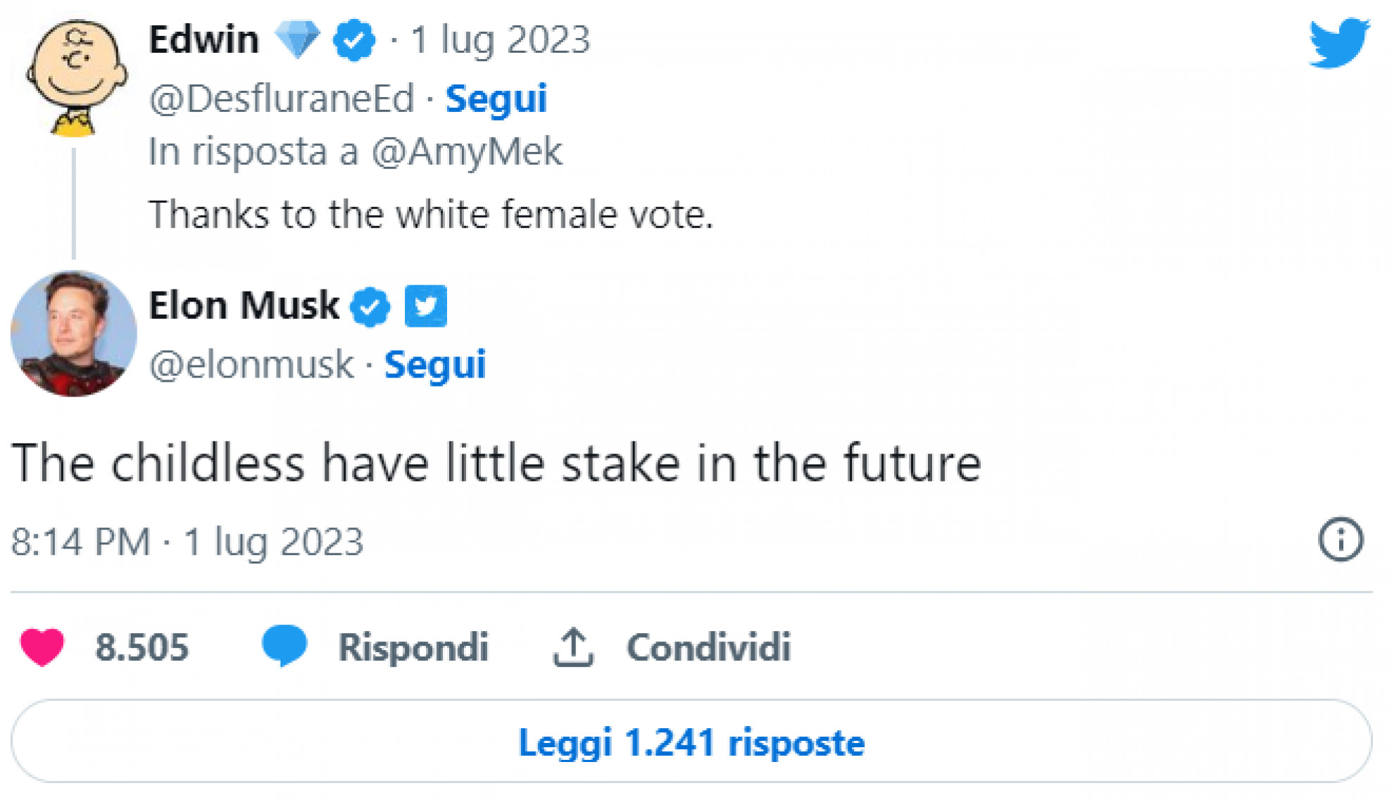 Ma non solo. Qualche ora prima, mentre la Francia si riversava in moti di rabbia e proteste a seguito dell’omicidio del 17enne Nahel, Musk non ha voluto perdere l'occasione per dire la sua, unendosi al coro dei commentatori (perlopiù simpatizzanti verso idee conservatrici e suprematiste) secondo cui la responsabilità dei disordini è da imputare alle ‘donne bianche e single’, accusate di "trasformare la Francia in un Paese a maggioranza musulmana". Musk, riprendendo il messaggio in questione, ha commentato: "Ha ragione, chi non ha figli ha poco interesse verso il futuro".