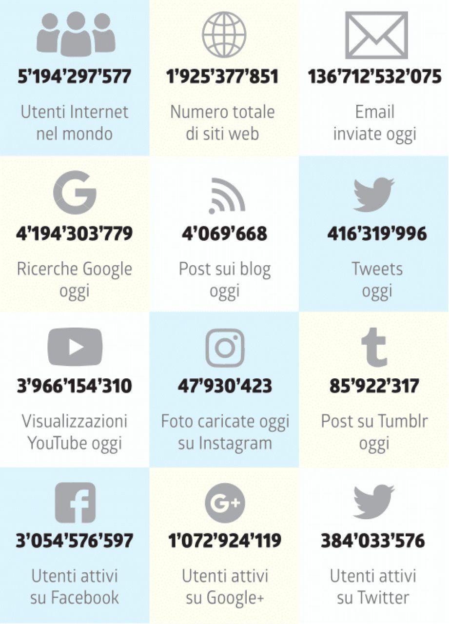 Approssimativamente internet è popolata da 5 miliardi di utenti e ospita 2 miliardi di siti web. Su YouTube ogni ora vengono pubblicate 300 ore di video e vengono visti 3 miliardi di video al giorno. Su Instagram compaiono ogni giorno 95 milioni di nuovi post.