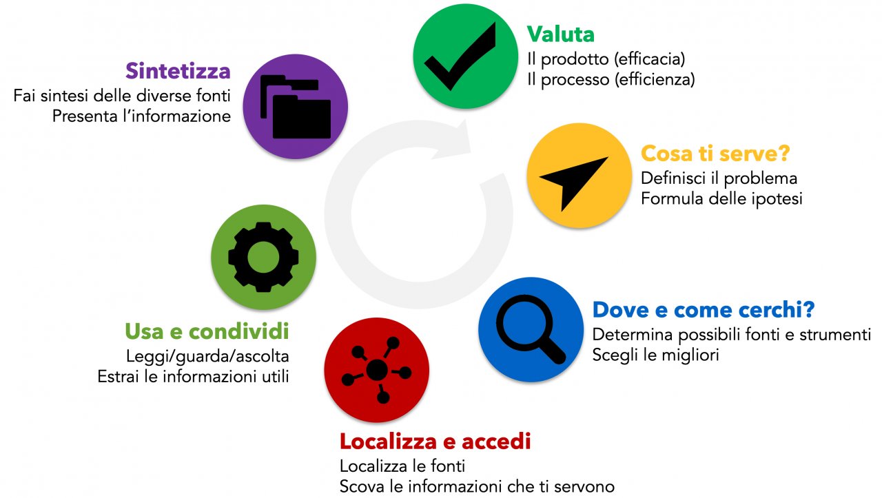 Dobbiamo poi sviluppare alcune competenze. Il modello Big6 presenta le competenze chiave di information literacy, cioè del sapersi informare: si inizia col formulare delle buone domande (invece che lasciare che sia il nostro social a decidere cosa dovrebbe interessarci), si prosegue con lo scegliere le fonti migliori (crearsi una mappa di fonti affidabili è il lavoro di una vita), per poi imparare a leggere criticamente testi o video o altro.