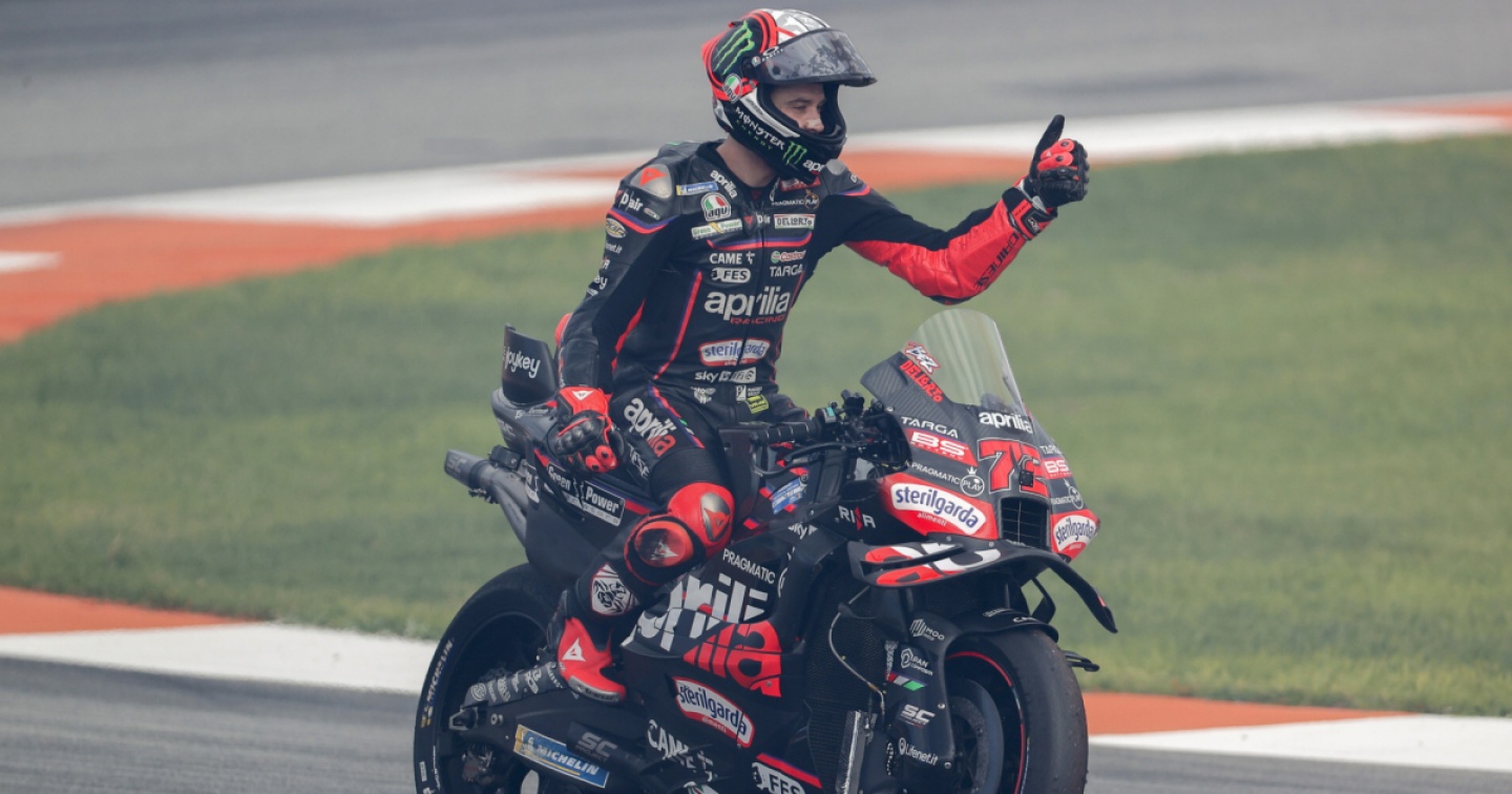 A Valencia l'italiano dell'Aprilia ha preceduto al traguardo il compagno di squadra Raul Fernandez