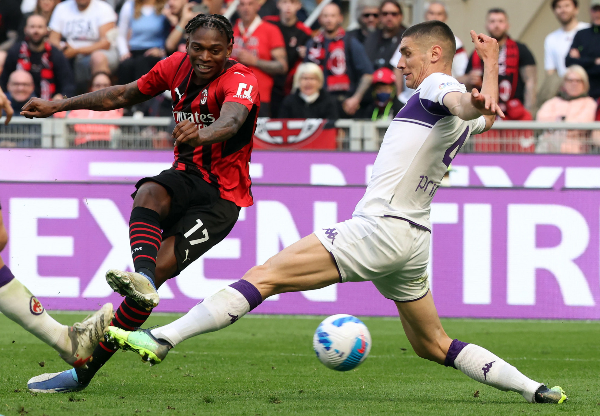 Rafael Leao sembra cambiato anche un livello più profondo e intangibile. Adesso gli basta pochissimo per essere letale, per creare un pericolo. Contro la Fiorentina, dopo sessanta minuti in cui il Milan aveva avuto molte occasioni, e Leao stesso ne aveva fallita una piuttosto semplice di destro dal centro dell’area di rigore, lui – come il resto della squadra – sembrava aver finito l’energia. Pioli ha sostituito tre dei quattro giocatori offensivi partiti titolari, ma – diversamente rispetto a qualche mese fa – ha deciso di tenerlo in campo. A dieci minuti dal termine della partita il portiere avversario, Terracciano, solitamente preciso con i piedi, sbaglia un passaggio filtrante che Leao intercetta a trequarti di campo. La Fiorentina è leggermente sbilanciata, ma Leao ha davanti Milinkovic, con il peso già abbassato sulle cosce aspettando il duello, e lo stanno recuperando da dietro sia Martinez Quarta che Amrabat. Una situazione in cui lo scorso anno avrebbe agito in modo prevedibile, sterzando sul sinistro per crossare o calciare in diagonale. Ma, come dicevamo, Leao non è lo stesso di prima: appena entrato in area, prima di venire raddoppiato, in un battito di ciglia si sposta la palla sul destro e calcia con un angolo stretto sul primo palo.