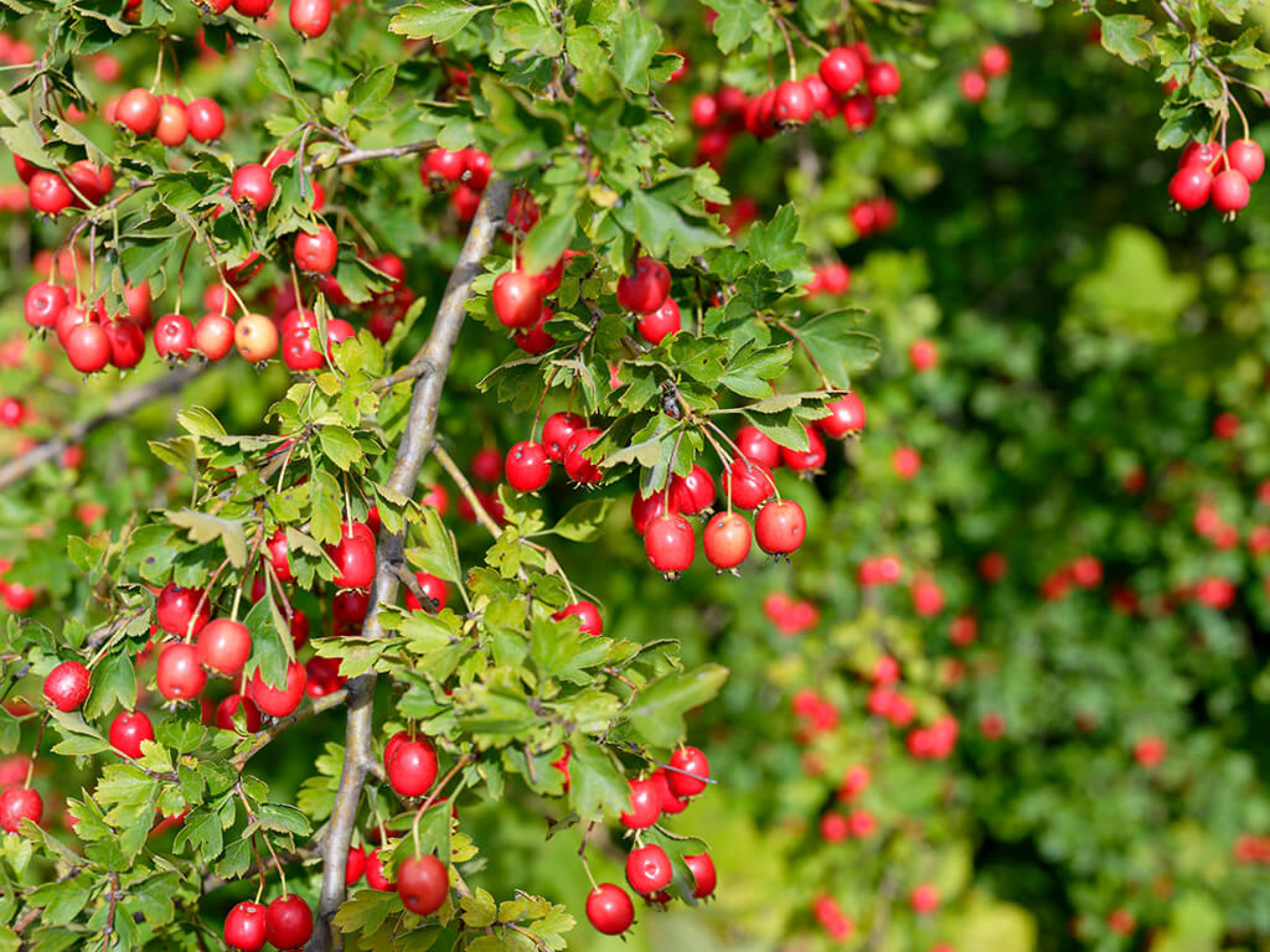 Biancospino: fiori bianchi e bacche rosse