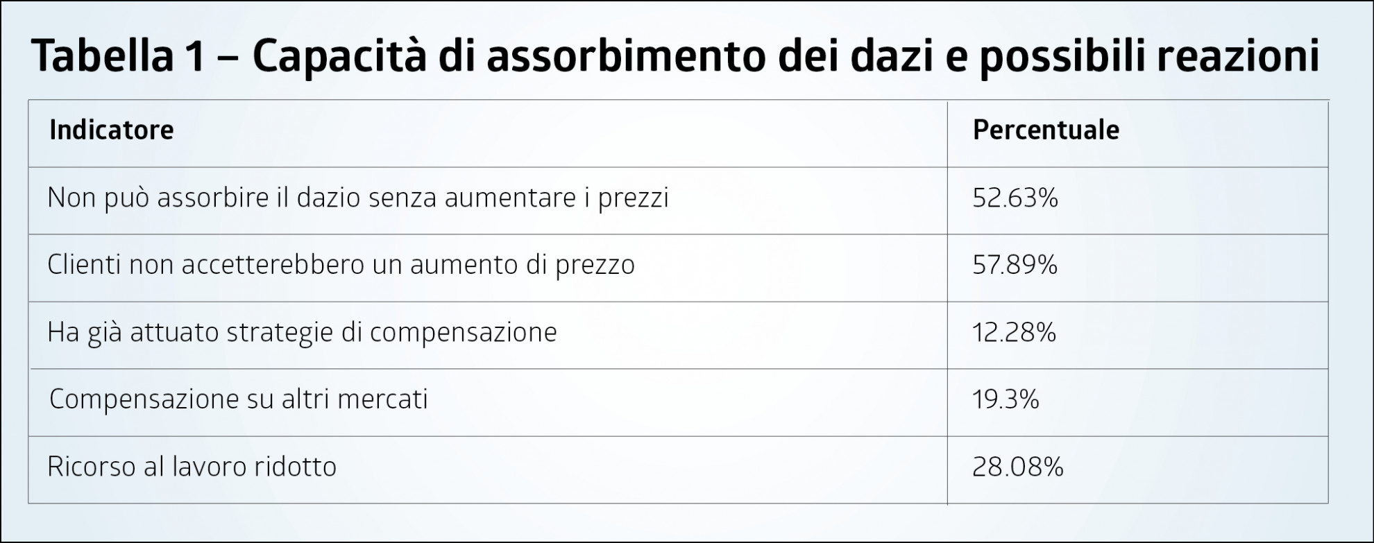 Nonostante ciò, le strategie di risposta al nuovo regime dei dazi appaiono ancora parziali e non strutturate, come è normale che sia in una situazione del genere. Prevale un certo attendismo che però deve essere combinato con valutazioni strategiche molto avanzate. Un dilemma all’insegna dell’incertezza che complica notevolmente il lavoro. Le ipotesi di compensazione su altri mercati o di ricorso al lavoro ridotto emergono, ma la quota di indecisi dimostra che prevale, appunto, l’attesa. Molte imprese stanno avviando confronti diretti con i partner americani per valutare una condivisione del peso dei dazi. In alcuni casi i maggiori costi possono essere trasferiti ai consumatori finali, in altri – specie in settori sensibili al prezzo – questo non è possibile.