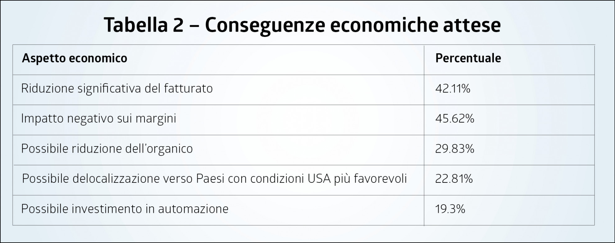 Dal punto di vista strategico, la delocalizzazione produttiva viene valutata da circa il 23% come un’opzione di lavoro concreta, mentre quasi un quinto individua nell’automazione un possibile correttivo per mitigare l’effetto dei dazi e rilanciare la competitività.