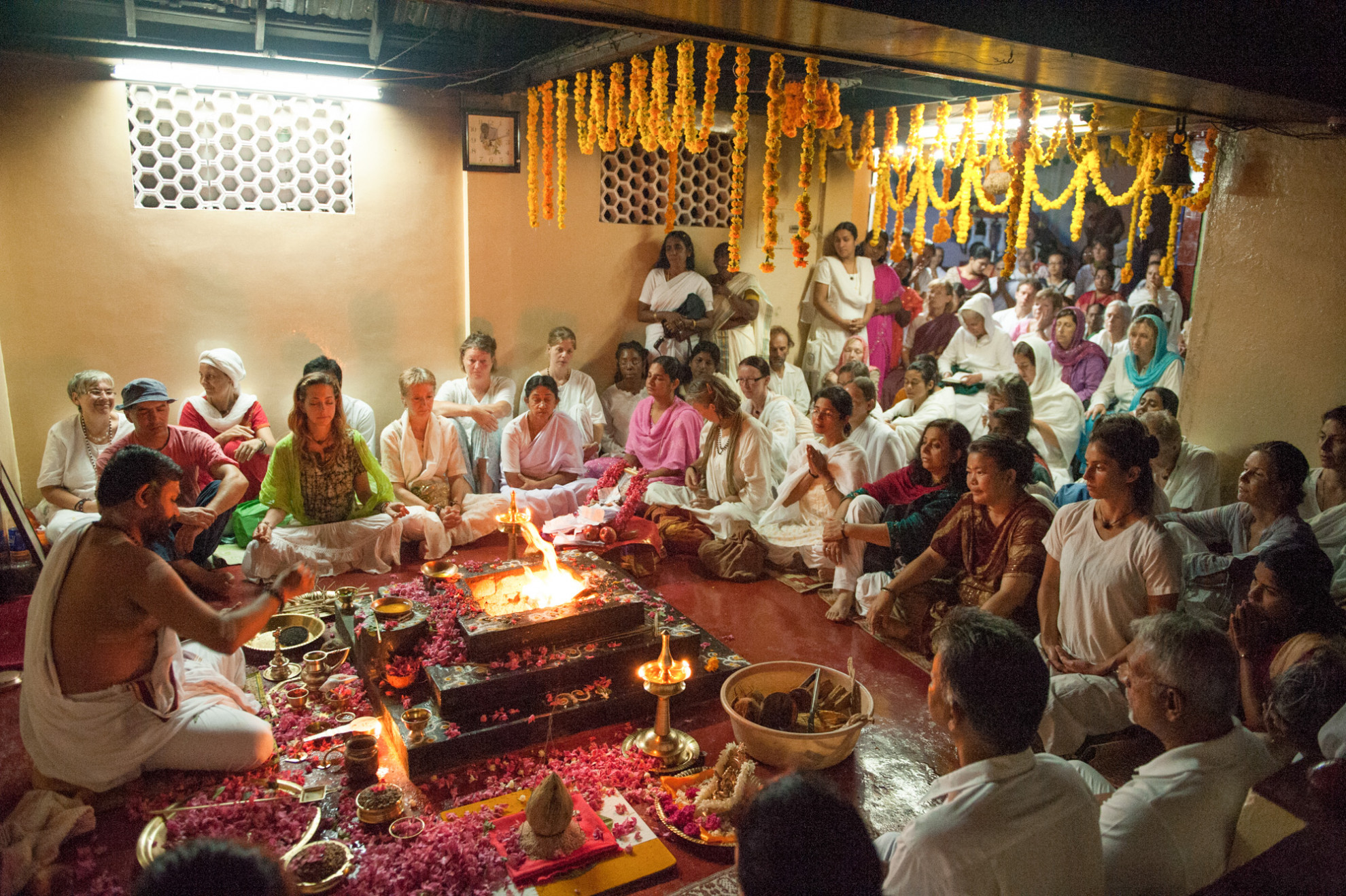 È ancora buio quando si levano i primi canti devozionali. Un monaco sta preparando il rituale del fuoco, una cerimonia tramandata dagli antichi saggi indiani, eseguita per mantenerci in armonia con le forze del cosmo, aiutandoci a rimuovere gli ostacoli sul cammino. Mezza assonnata, penso che sia un bel modo per iniziare la giornata. Siamo una trentina, ci sono indiani, europei, soprattutto donne. Qualche cane curioso. Tra nuvole di sandalo e collane di fiori, seguiamo come ipnotizzati i gesti del religioso e la danza del fuoco, che sembra quasi prendere forma. Nell’induismo è considerato una divinità. Agni, il fuoco, che collega terra e cielo. Citato negli antichi testi sacri Veda: “Colui che appartiene a tutti gli uomini; con la sua luce dissipa le tenebre”. Vedo arrivare un’anziana, avvolta in un sari bianco, capelli color argento, osservo il suo passo lento. Prima di sedersi, si mette della cenere nel punto tra le sopracciglia. È un gesto simbolico, carico di significato: focalizza l’intenzione sul terzo occhio, quello rivolto verso l’interno, che non viene distratto dal caos del mondo esterno. I primi passi dell’alba sono nel tempio interiore, camminando verso la propria divinità.