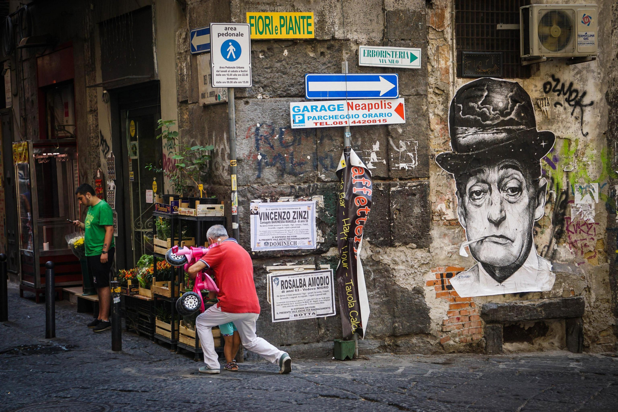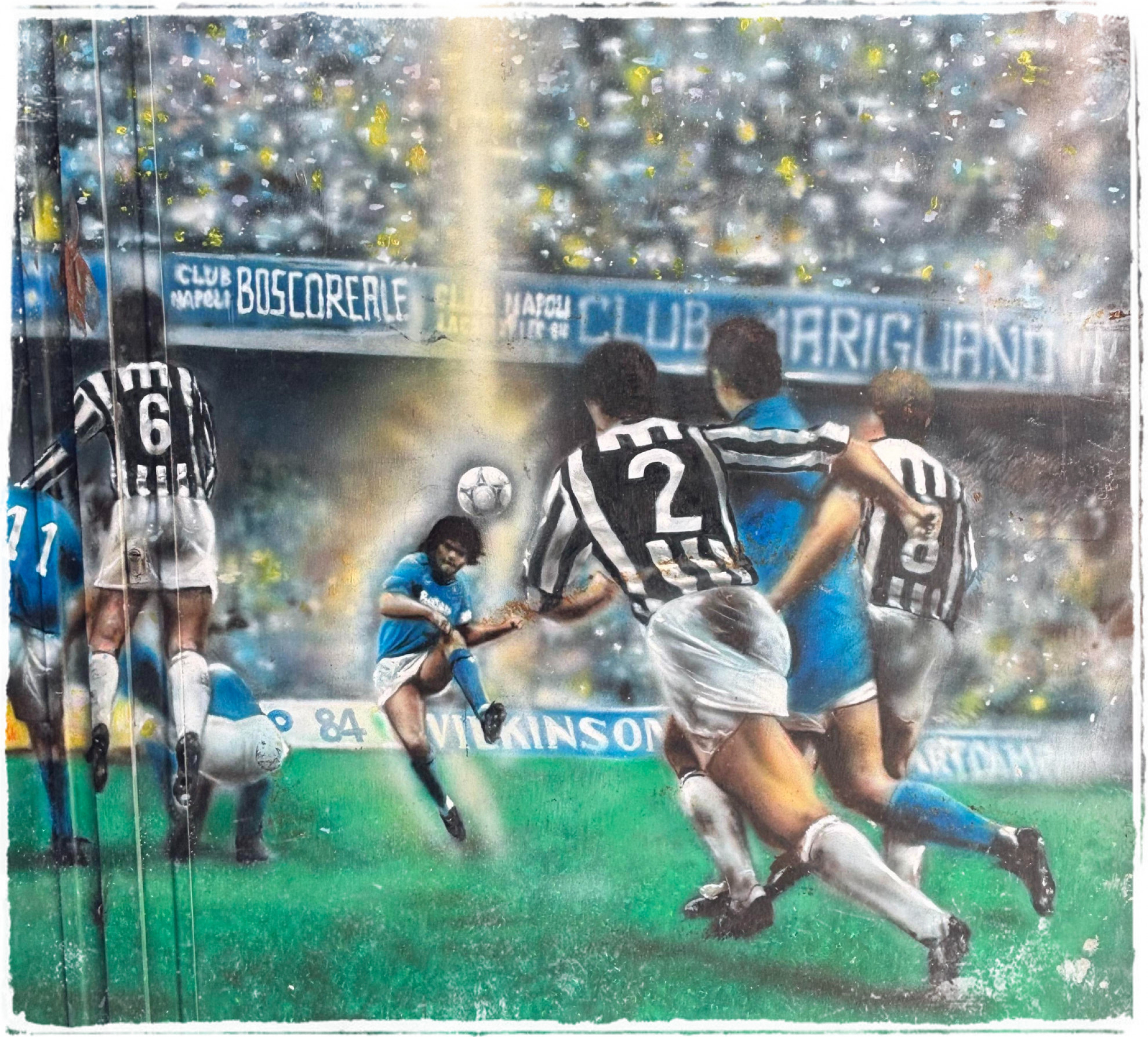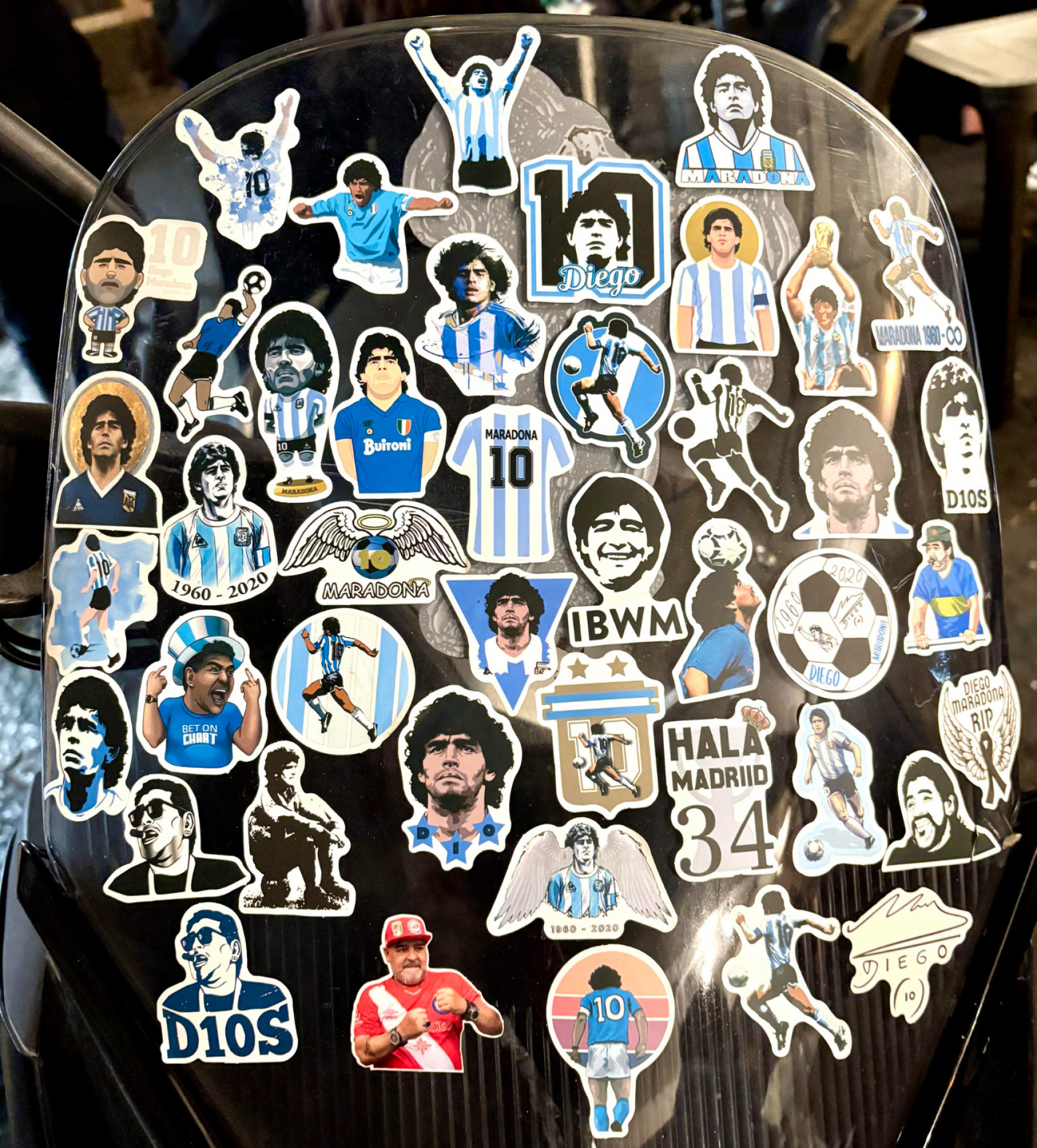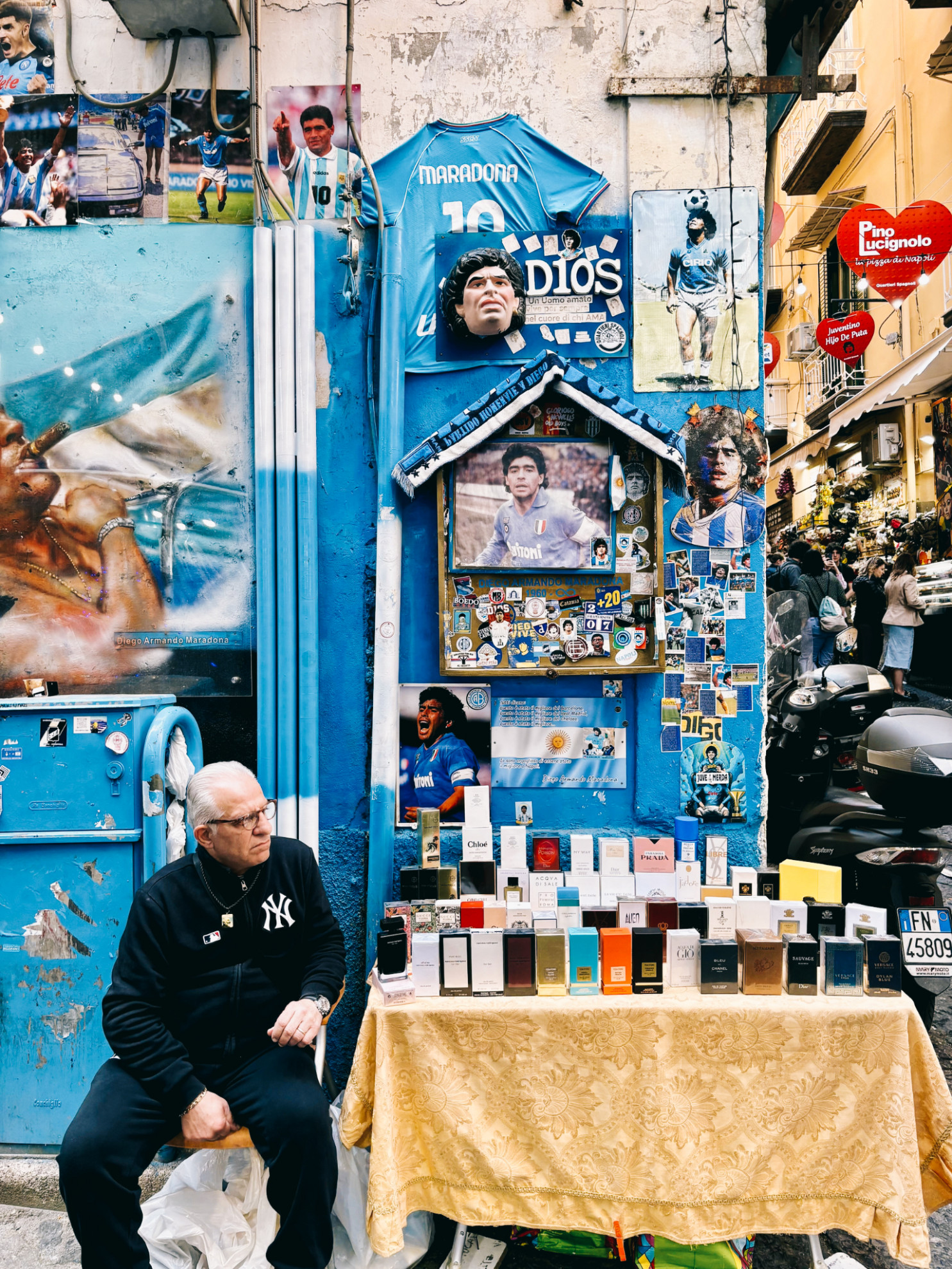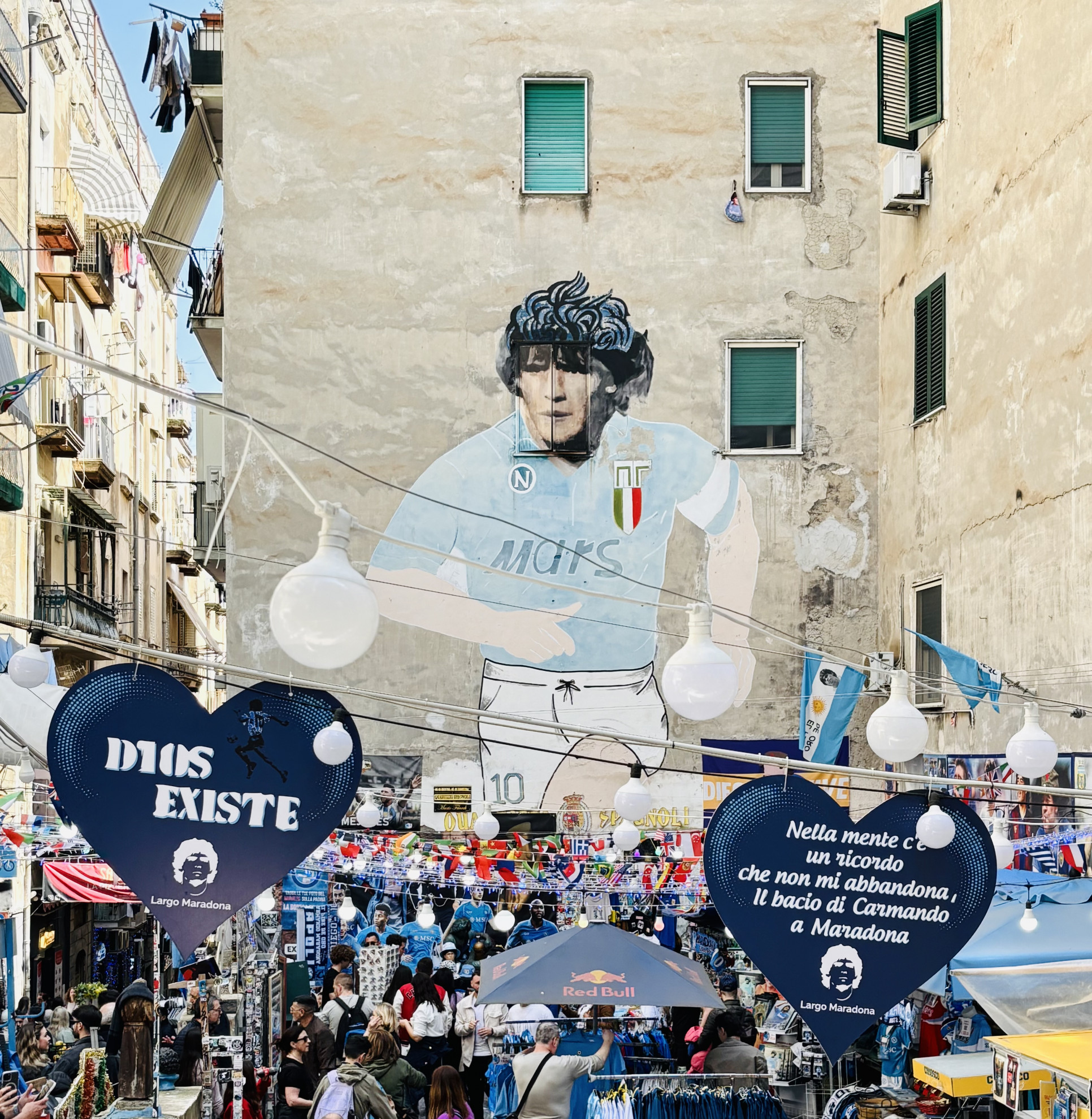 Ho visto Maradona. L’ho visto con l’aureola da santo e con in mano una limonata, con intorno la scritta “Ovunque proteggi” e quella “Spritz a 3 euro”. L’ho visto con la maglia del Napoli di ieri e di oggi, con le ali da angelo e la pizza in mano, con la divisa dell’Argentina e quella di Napoleone. L’ho visto in versione lattina (di birra, di tè, di energy drink), carta da gioco, magnete e carretto dei popcorn. Impossibile girare per il centro cittadino e non incrociare il suo sguardo.