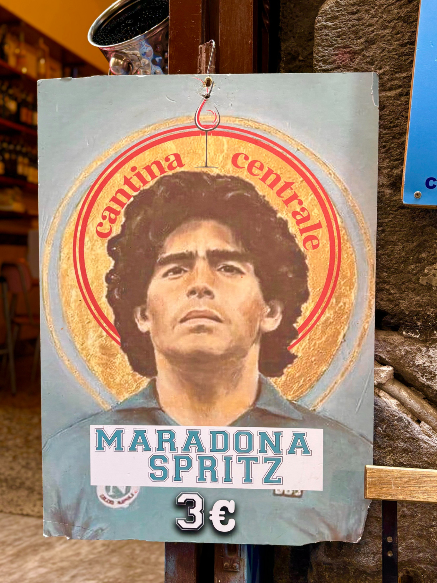 Ho visto Maradona. L’ho visto con l’aureola da santo e con in mano una limonata, con intorno la scritta ‘Ovunque proteggi’ e quella ‘Spritz a 3 euro’